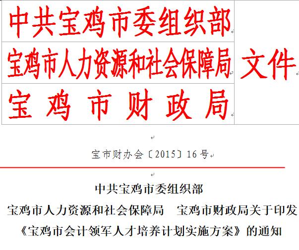 为贯彻落实《财政部全面推进管理会计体系建设的指导意见》、《陕西省会计领军人才培养计划实施方案》和《陕西省会计行业中长期人才发展规划(2010—2020年)》精神,着力培养一批复合型、高层次会计人才,打造一支适应我市经济社会发展需要的领军人才队伍,促进我市会计人才整体素质的全面提升,经研究,市委组织部、市人力资源和社会保障局、市财政局决定实施我市会计领军人才培养计划。现将《宝鸡市会计领军人才培养计划实施方案》印发你们,请各县(区)财政部门具体组织实施,各有关单位结合实际,认真贯彻执行。