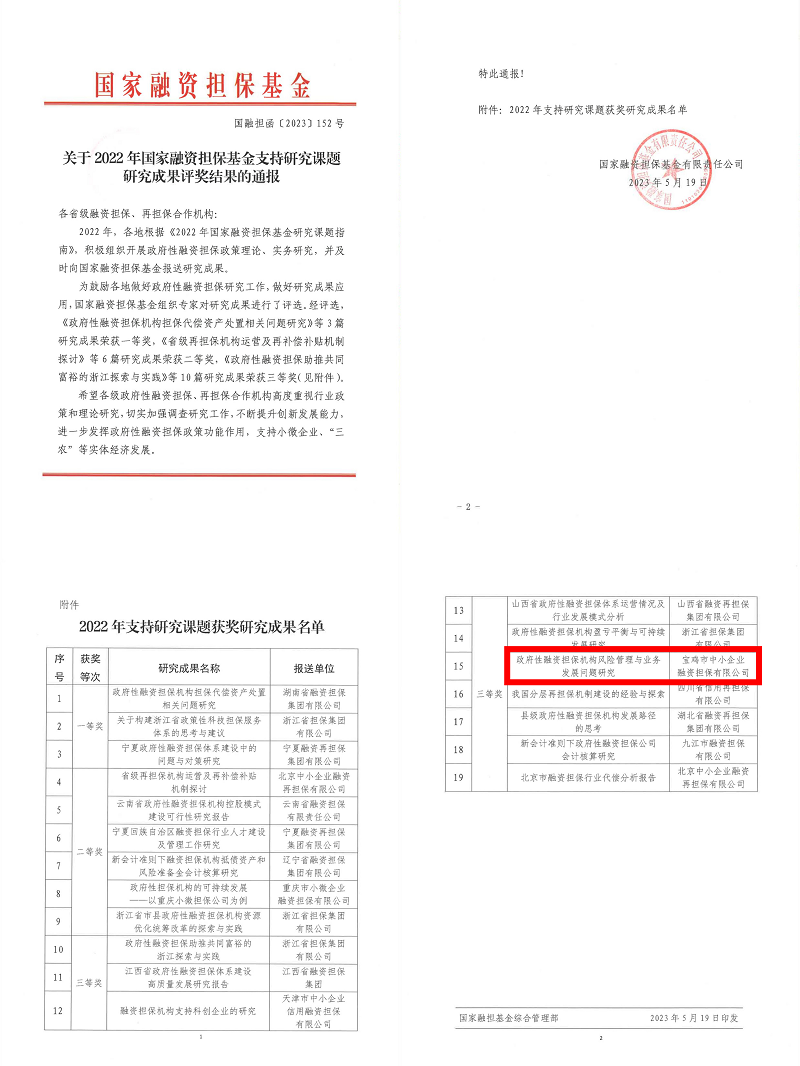 近日,国家融资担保基金通报表彰了一批优秀研究成果,市融资担保公司《政府性融资担保机构风险管理与业务发展问题研究》荣获“国家融资担保基金2022年支持研究课题研究成果三等奖”,是我省唯一获奖的调研课题,全国仅有2家地市级担保机构获此殊荣。