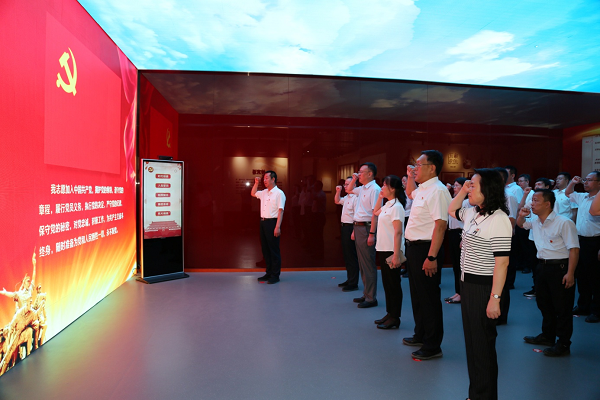 在二楼宣誓大厅,党员们列队整齐,面向党旗,高举右拳,用铿锵有力的声音,庄严宣誓。